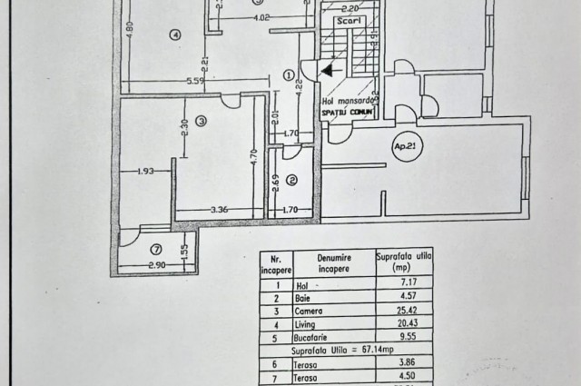 Apartamentul beneficiază de o suprafață utilă de 67,14 mp, distribuită eficient între două camere mari, o bucătărie separată, un hol generos și o baie complet utilată. Suprafața totală de 75,50 mp include și terasele și zona de acces, iar suprafața construită de 87,53 mp reflectă toate zonele comune ale imobilului.